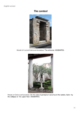 English version The context HOUSE OF LUCIUS CAECILIUS IUCUNDUS. The entrance. ©SSBAPES. HOUSE OF CAECILIUS IUCUNDUS. On this side of peristylium were found the tablets, fallen by the collapse of the upper floor. ©SSBAPES. 23