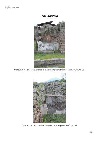English version The context OSTELRY OF FABII. The Entrance of the building from thermopolium. ©SSBAPES. OSTELRY OF FABII. Finding place of the inscription. ©SSBAPES. 33
