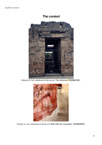 English version The context HOUSE OF THE LARARIUM OF ACHILLES. The entrance. ©SSBAPES. HOUSE OF THE LARARIUM OF ACHILLES. Wall with the inscription. ©SSBAPES. 38