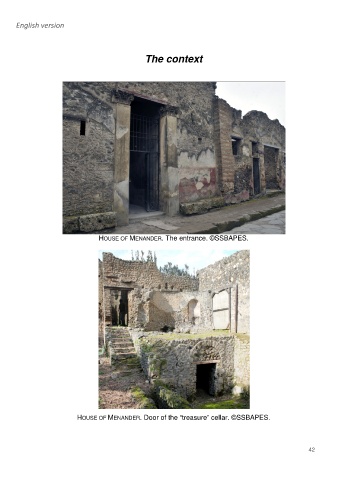 English version The context HOUSE OF MENANDER. The entrance. ©SSBAPES. HOUSE OF MENANDER. Door of the “treasure” cellar. ©SSBAPES. 42